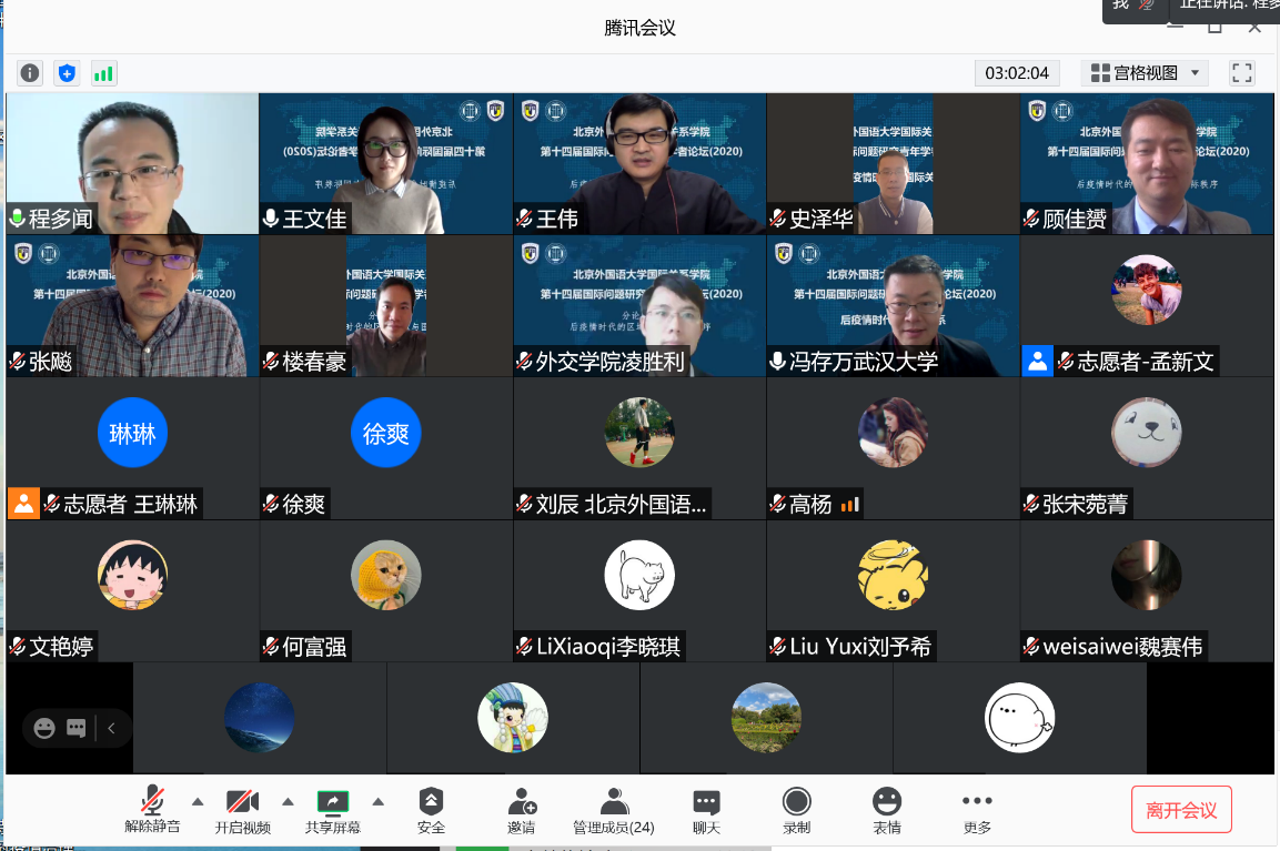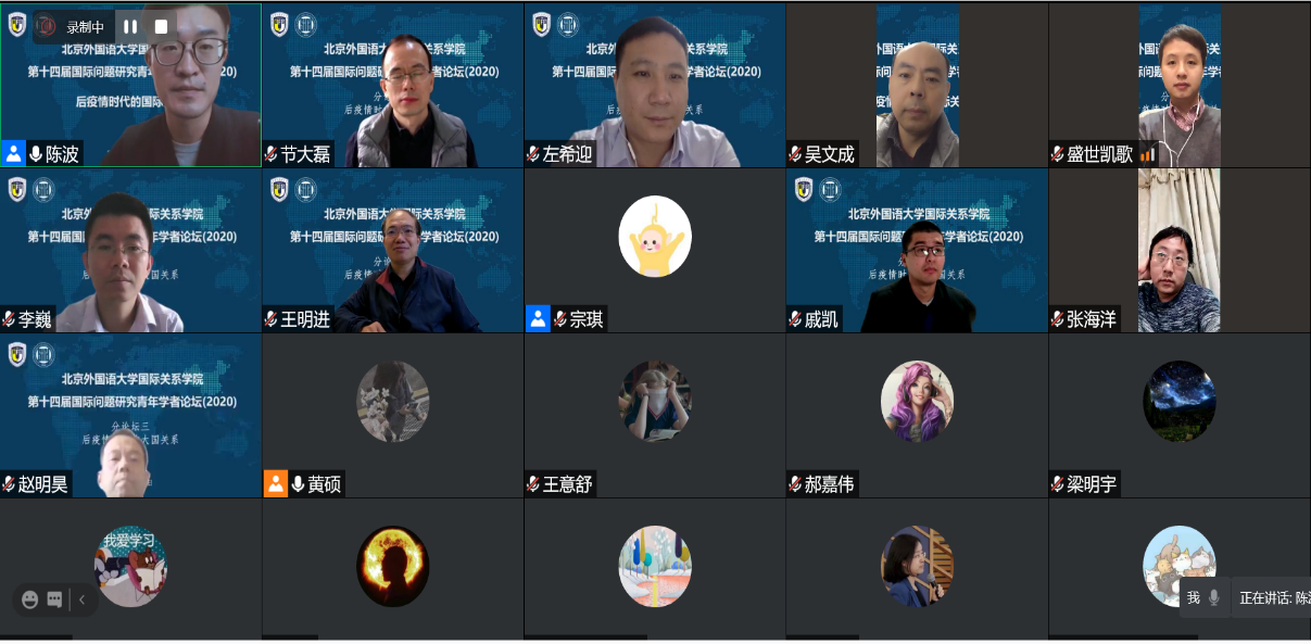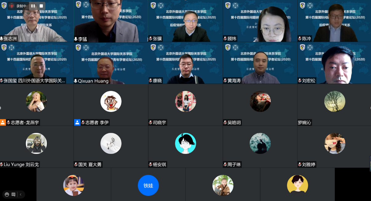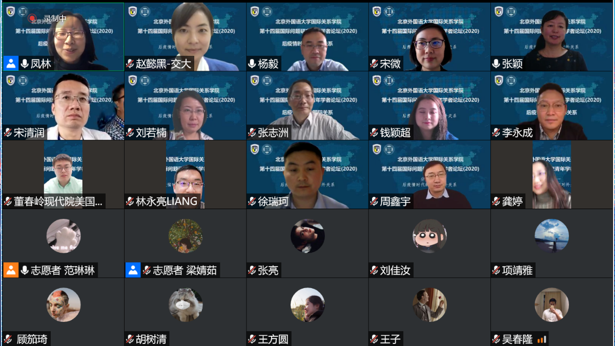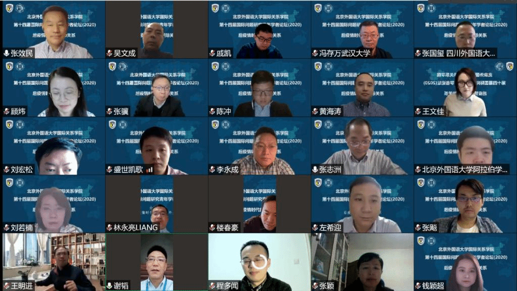 2020年11月21日,beat365英国官网网站成功举办第十四届国际问题研究青年学者论坛。论坛主题为“后疫情时代的国际关系”,以线上形式举行,与会学者50多人,来自北京大学、清华大学、中国人民大学、复旦大学、上海交通大学、南开大学、武汉大学、中央民族大学、中国政法大学、对外经贸大学、外交学院、beat365英国官网网站、四川外国语大学、beat365英国官网网站等高校,中国社会科学院、中国现代国际关系研究院、中国国际问题研究院、中联部当代世界研究中心、商务部国际贸易经济合作研究院、上海社会科学院、上海全球安全治理研究院等研究机构。beat365英国官网网站党总支张效民书记主持开幕式,谢韬院长致欢迎辞。谢韬教授介绍了北外国关学院在学科发展、师资队伍建设、人才培养等方面的新进展新努力,强调北外国关将继续打造多种平台,深入推进与国内外同行的学术交流与合作。