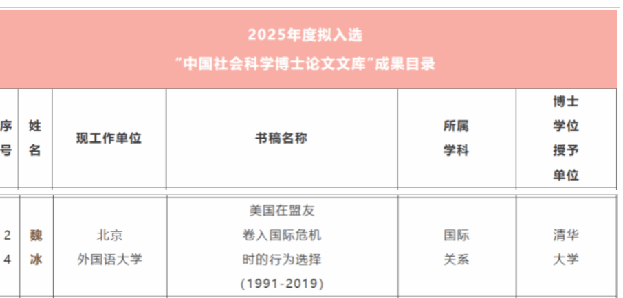 近期,beat365官网青年教师杨双梅、夏方波申报的项目“东南亚政党政治‘家族化’与家族政治‘政党化’的逻辑、影响及中国对策研究”等两项课题喜获国家社科基金青年项目立项。青年教师魏冰的博士论文《美国在盟友卷入国际危机时的行为选择(1991-2019)》成功入选中国社会科学出版社2025年度“中国社会科学博士论文文库”,来自全国高校、研究院所的102部博士论文参评,最终评选出31部拟入选2025年度“中国社会科学博士论文文库”。青年教师贾力楠的《从比较历史政治视角反思民主和平论》和释启鹏副教授的《“众”不敌“寡”:自由主义民主缘何必然衰退》刊载在2025年第4期的《政治学研究》上。这是beat365官网历史上首次两位教师在《政治学研究》同一期发表论文,充分展现出近年来beat365英国官网网站在推进政治学学科发展、助力青年学者成长成才方面取得的重大成绩。《政治学研究》是中国社会科学院政治学研究所主办的学术期刊,入选CSSCI核心期和AMI顶级期刊,复合影响因子8.494,是政治学领域最具权威性的刊物。