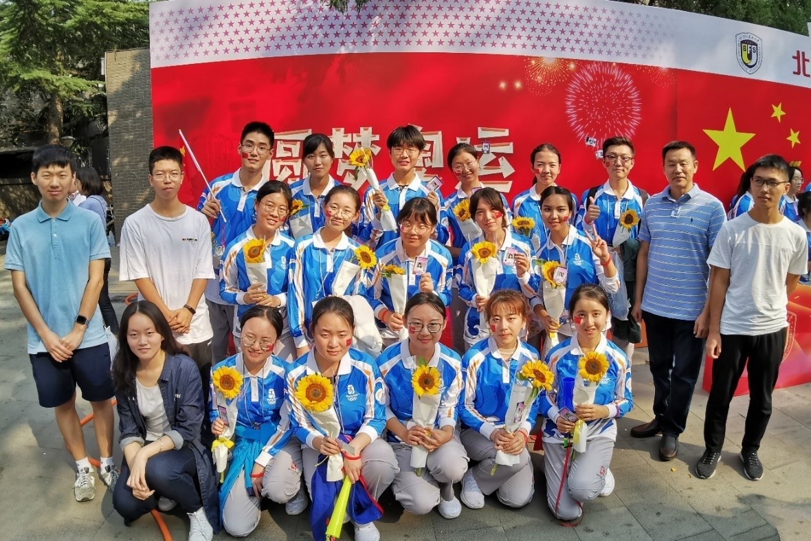 10月1日下午2时,参加国庆庆祝活动的学生返回学校,beat365英国官网网站党总支书记张效民及学生代表到文化广场迎接,祝贺他们圆满完成任务并表示慰问。