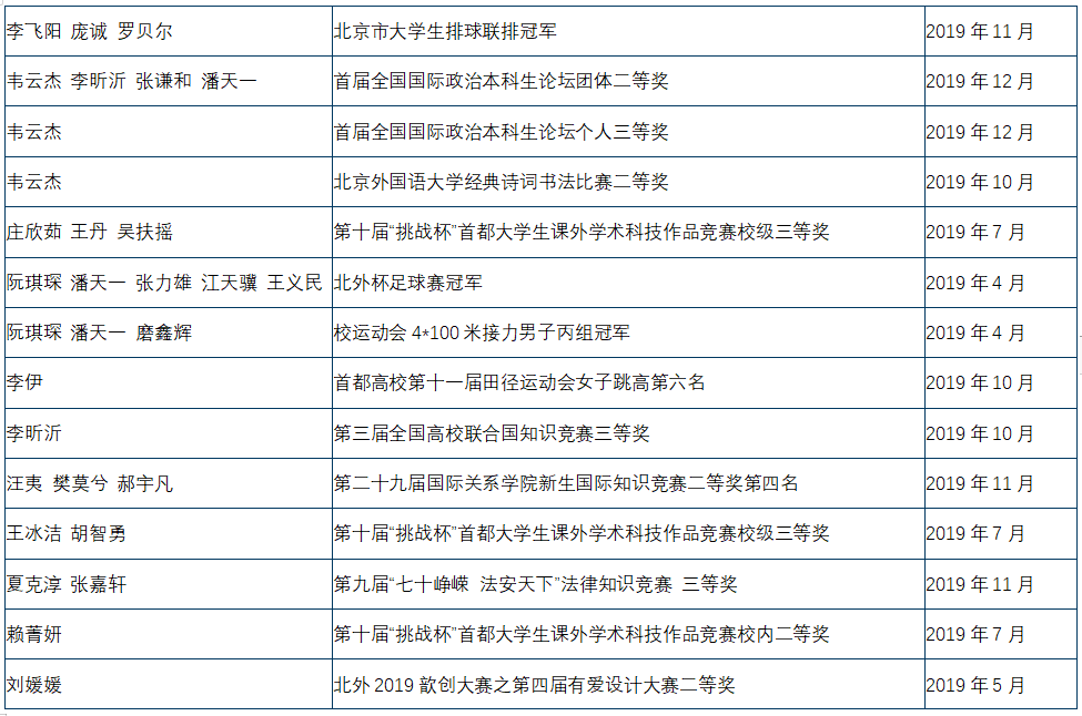 beat365英国官网网站秉承学校“人才培养服务于国家发展战略的需要”这一目标,致力于培养具有国际视野、中国情怀、复合型复语型的高层次国际化人才。beat365官网毕业生扎实掌握国际关系、国际政治、外交学专业知识,深刻了解区域和全球议题,敏锐洞察国际形势发展演变;他们厚植中国历史,传承中国文化,心系中国发展,弘扬爱国主义精神;他们博学笃行,知识丰富,视野开阔、精通外语,跨文化沟通能力出众;他们勇于创新,积极参与国际会议、大型赛事等志愿活动,实践能力卓越;他们多才多艺,积极参加各种赛事并多次获奖。