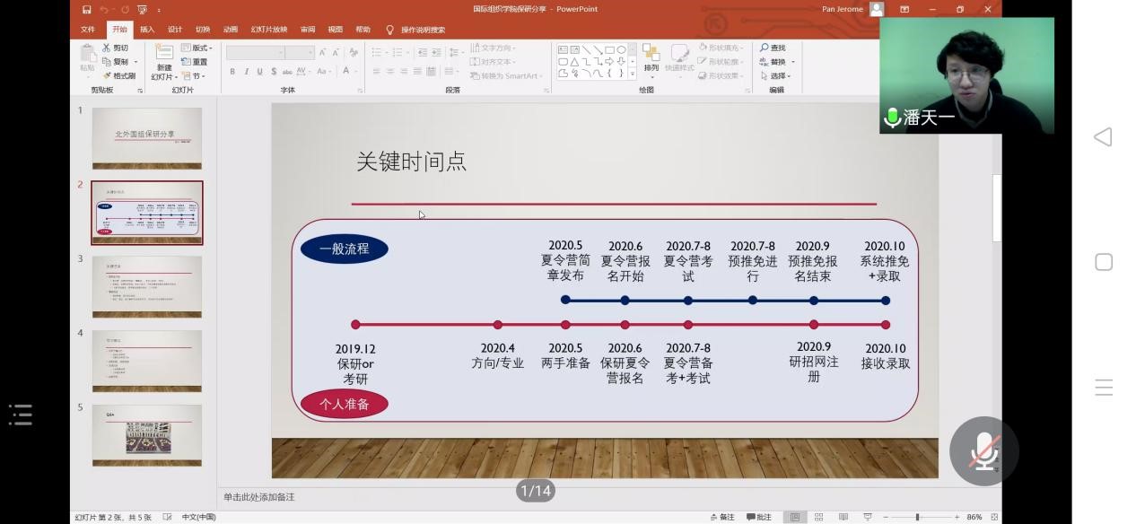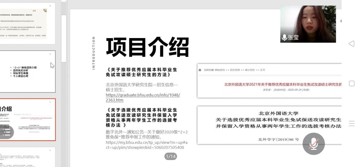 北外的优秀毕业生张家郡学长对高校的行政岗位、辅导员岗位招聘进行了介绍,并结合自身的工作经历分享了宝贵经验。接着,2017级外交学专业本科生张莹同学分享了她的“2+2”推免保经验。张莹同学首先介绍了“2+2”推免保的要求,随后从自身经历出发,分享了准备过程与注意事项。