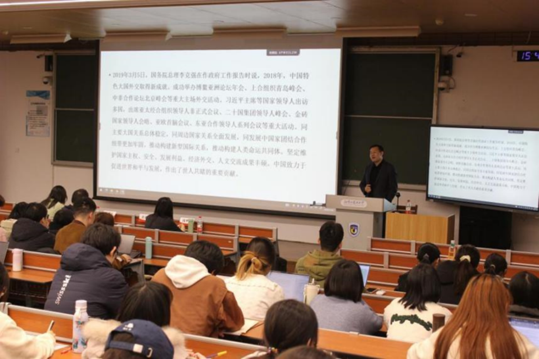 随后,张效民书记运用中英双语,围绕“大国外交与青年责任”的主题进行了深入剖析。他从大国外交和青年责任两个部分展开,由大国外交的定义和内涵引入,并利用图表详细解读了中国与其他国家在综合国力、对外贸易等多个方面的发展情况,使同学们对国家间的力量对比有了清晰的认识,并从多个维度解读了中国式现代化。张效民书记还阐述了中国外交政策在不同历史阶段的演变和特征,以及中国特色大国外交的创新点,向同学们展示了当前的国际形势,以及中国所面临的外部风险和相关的外交策略。