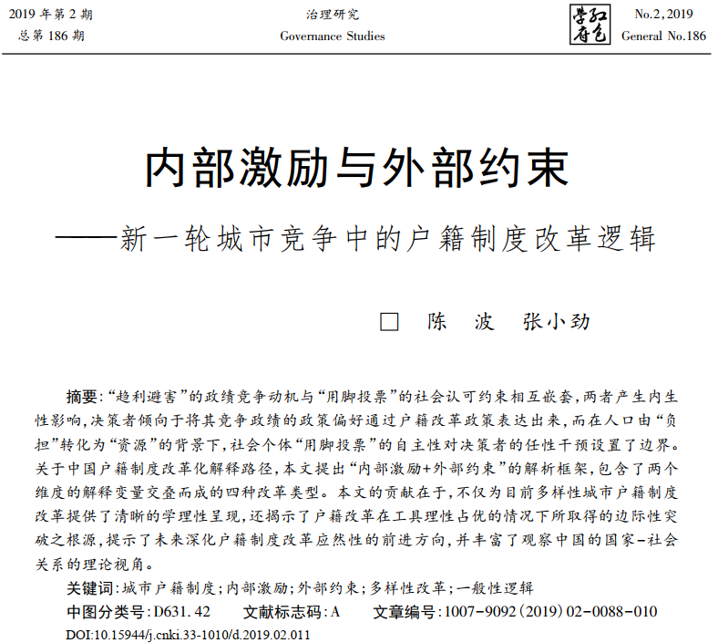beat365英国官网网站教师陈波以第一作者在CSSCI期刊《治理研究》发表论文:《内部激励与外部约束——新一轮城市竞争中的户籍制度改革逻辑》,论文摘要和原文链接如下: