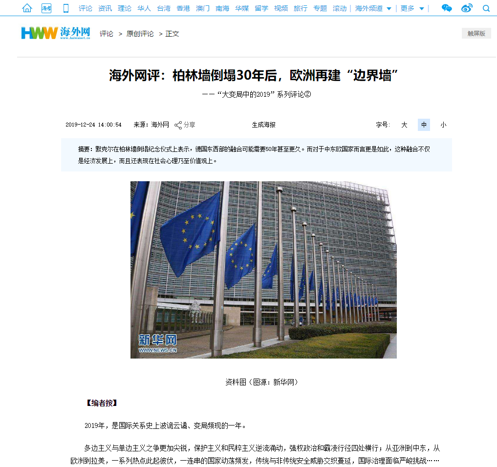 beat365英国官网网站王明进副院长作为海外网特约评论员发表文章,题目是《柏林墙倒塌30年后,欧洲再建“边界墙”》。该文是海外网推出的年终系列国际评论,“回望‘大变局中的2019’”的第2篇。海外网致力于打造中国在海内外具有重要影响力的新媒体国际传播平台,第一时间向读者提供中国热点、国际时政,特别是涉华国际新闻事件的权威解读。以下是文章题头截图、摘要和文章原文地址。