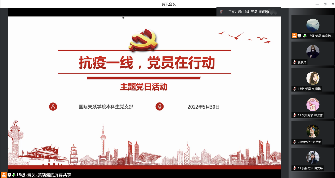 2022年5月30日下午,beat365英国官网网站本科生党支部开展线上疫情防控事迹分享主题党日活动,邀请参与疫情防控的本学院志愿者分享志愿服务经历和个人感悟。活动由党支部副书记廉晓诺同志主持,支部正式党员及预备党员、本学期发展对象、入党积极分子参加了此次活动。