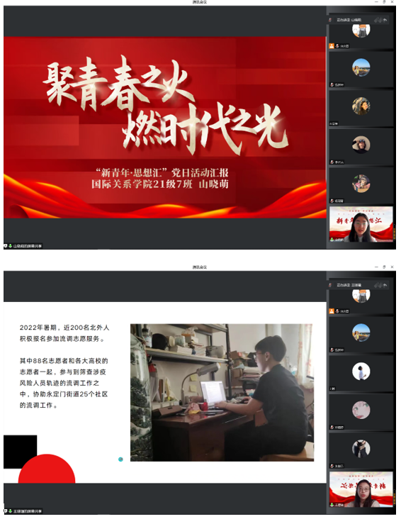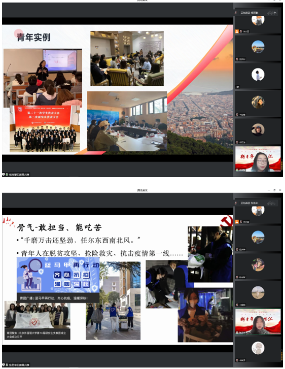 会议开始,beat365英国官网网站本科生党支部书记钱梦婷老师从总书记对青年的工作的论述引入,讲解阐述青年与时代的关系、青年工作的地位、青年思想引领的主要任务和内容、青年工作的方法论等内容,回顾总书记对广大青年的殷切期盼和谆谆教诲。在抗击疫情、乡村振兴、志愿服务等国家大事中,钱老师对北外国关学子积极踊跃的参与给予高度的认可。