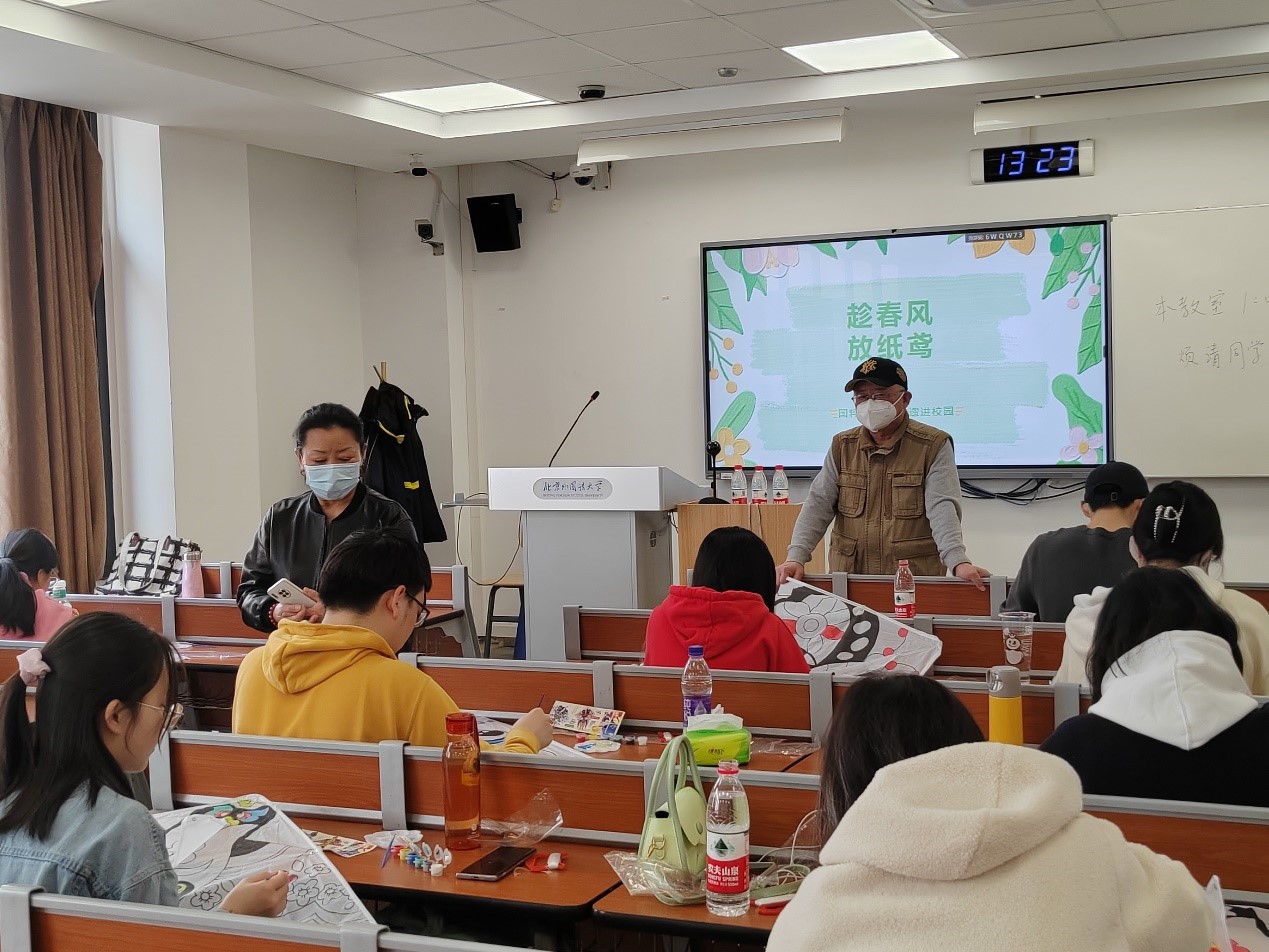 本次活动于322日下午2点在逸夫楼505举办,邀请了国家级社会体育指导员、北京市风筝协会理事赵冠璞老师、刘佩静老师现场指导。老师们首先为同学们讲解了风筝的历史和起源。“风筝”源于东周春秋时期,至今已有两千多年的历史,相传墨翟以木头制成木鸟,研制三年而成,这便是人类最早的风筝。后来鲁班用竹子改进风筝材质,东汉蔡伦改进造纸术后,坊间开始用纸做风筝,一直到宋代,放风筝已成为人们非常喜爱的户外活动之一。老师还向同学们现场展示了“扎、糊、绘、放”等传统制作工艺,并向同学们介绍了各地举办风筝赛事的情况。通过老师的讲解,同学们不仅了解了风筝的历史,而且近距离欣赏与感受了风筝艺术的魅力。