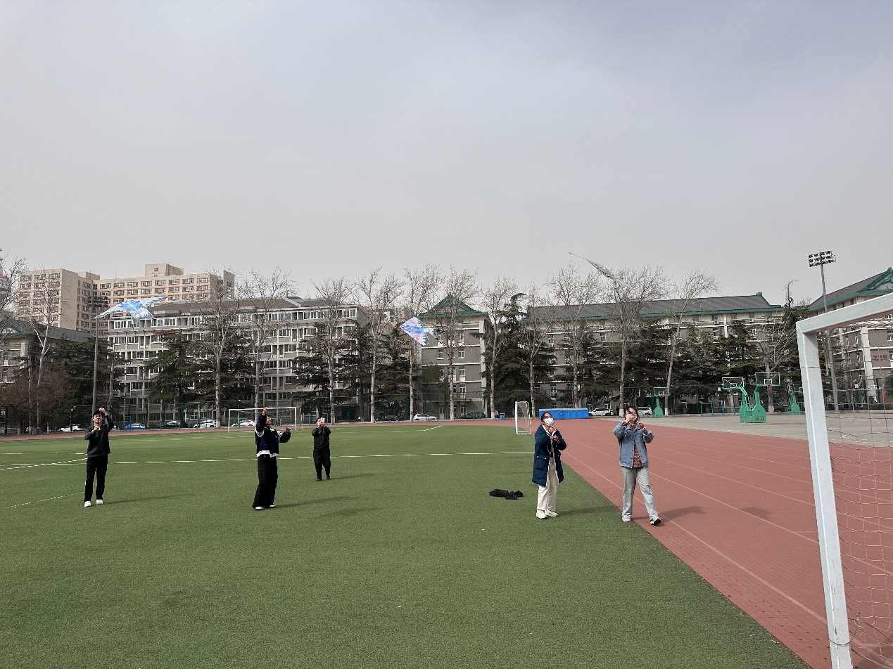 最后老师带领同学们进行了放飞展示。在北外美丽的校园中,绿树娇花掩映,蓝天白云相依,杨柳春风拂面,燕子纸鸢比翼,同学们手擎线盘,看风筝扶摇直上,在这个美丽的人间三月,共赴一场纸鸢之约,春天之约。