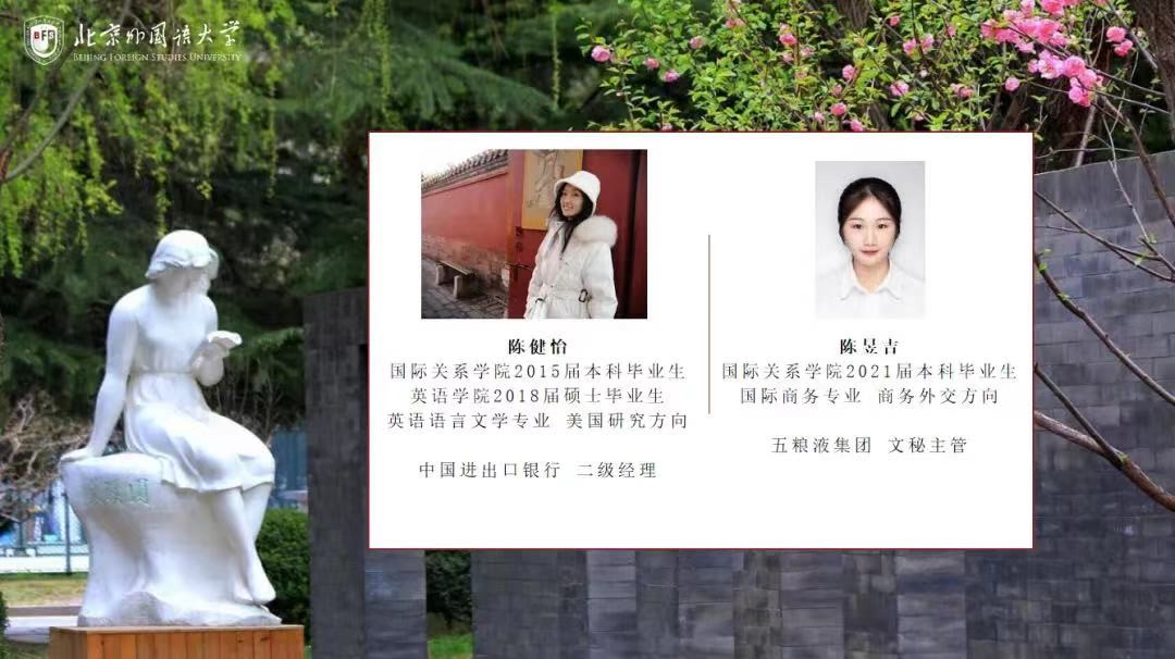 2023年5月5日晚,beat365英国官网网站成功举办就业力大赛系列活动最后一场——国企就业分享会。在beat365英国官网网站研究生会的精心组织下,本次分享会中邀请了在中国进出口银行工作的2018届英语学院硕士毕业生陈健怡和在五粮液集团工作的2021届beat365英国官网网站硕士毕业生陈昱吉为beat365英国官网网站在校学生分享国企求职与工作经验与心得体会。